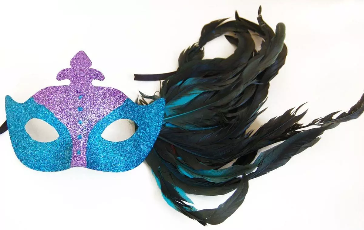 This gorgeous, light plastic mask is adorned with glitter and features both a colorful feather plume and ribbon ties for a comfortable fit that is sure to stand out!