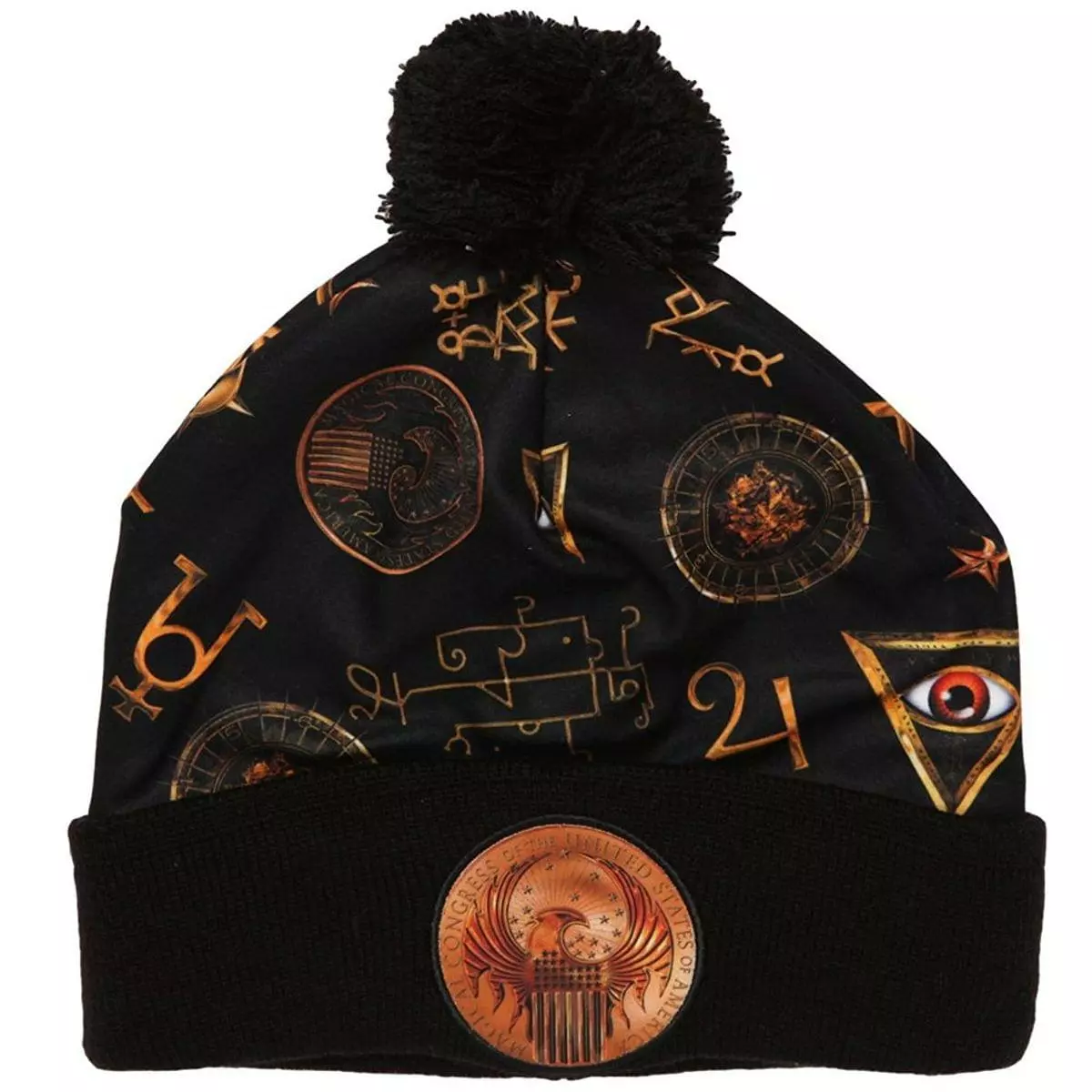 Keep your head warm while looking cool in this Fantastic Beasts Cuff Knit Beanie! Warm black beanie features the MACUSA seal on the cuff and magical icons on the cap. Topped with a black pom pom. One size fits most. Officially licensed. Makes a great gift to any Harry Potter fan!
