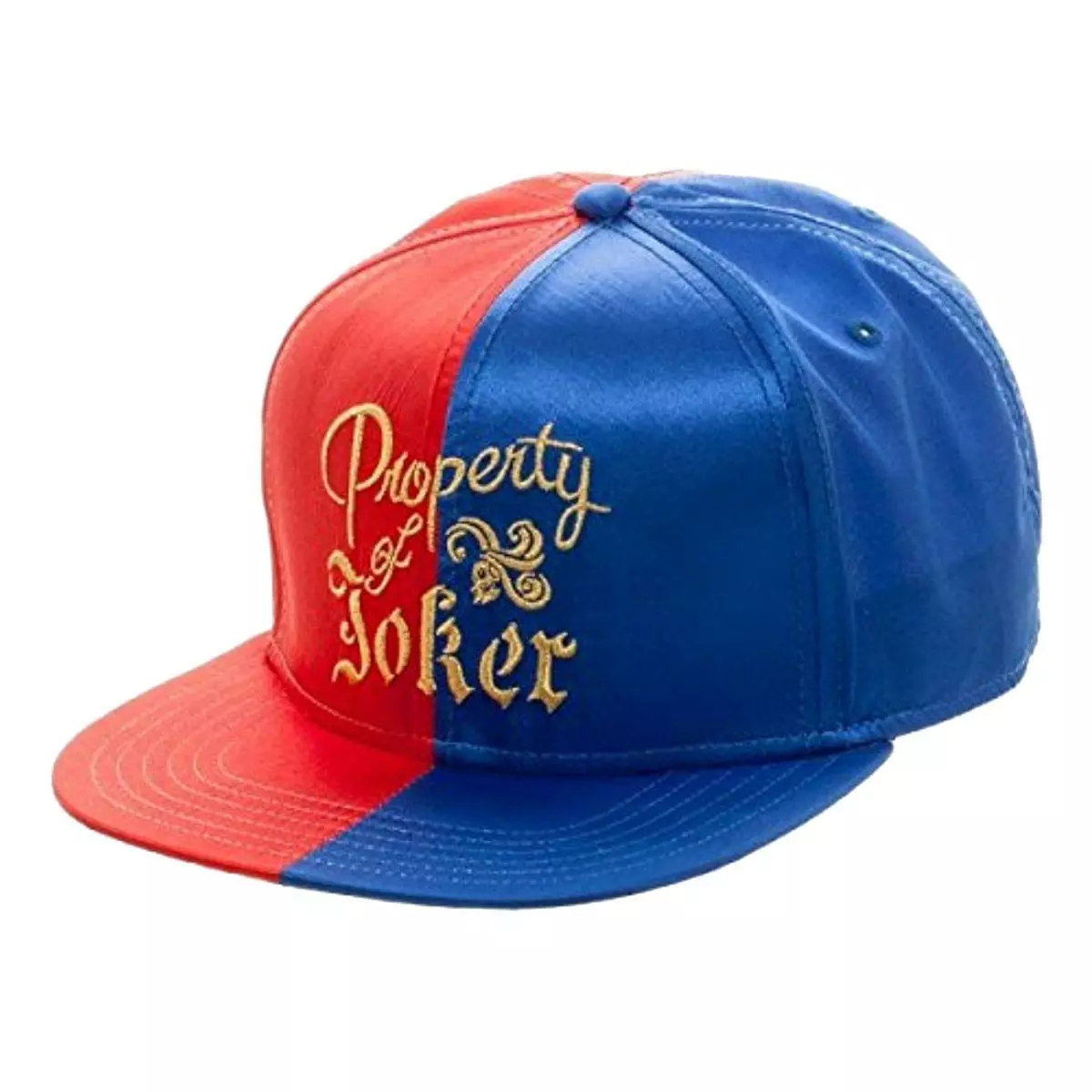 Wear your love of Harley Quinn with this officially licensed Suicide Squad Snapback Hat! Red and blue satin hat features the gold 3D embroidered text “Property of Joker”. “Suicide Squad” is printed on the back. Snap closure is adjustable. One size fits most.