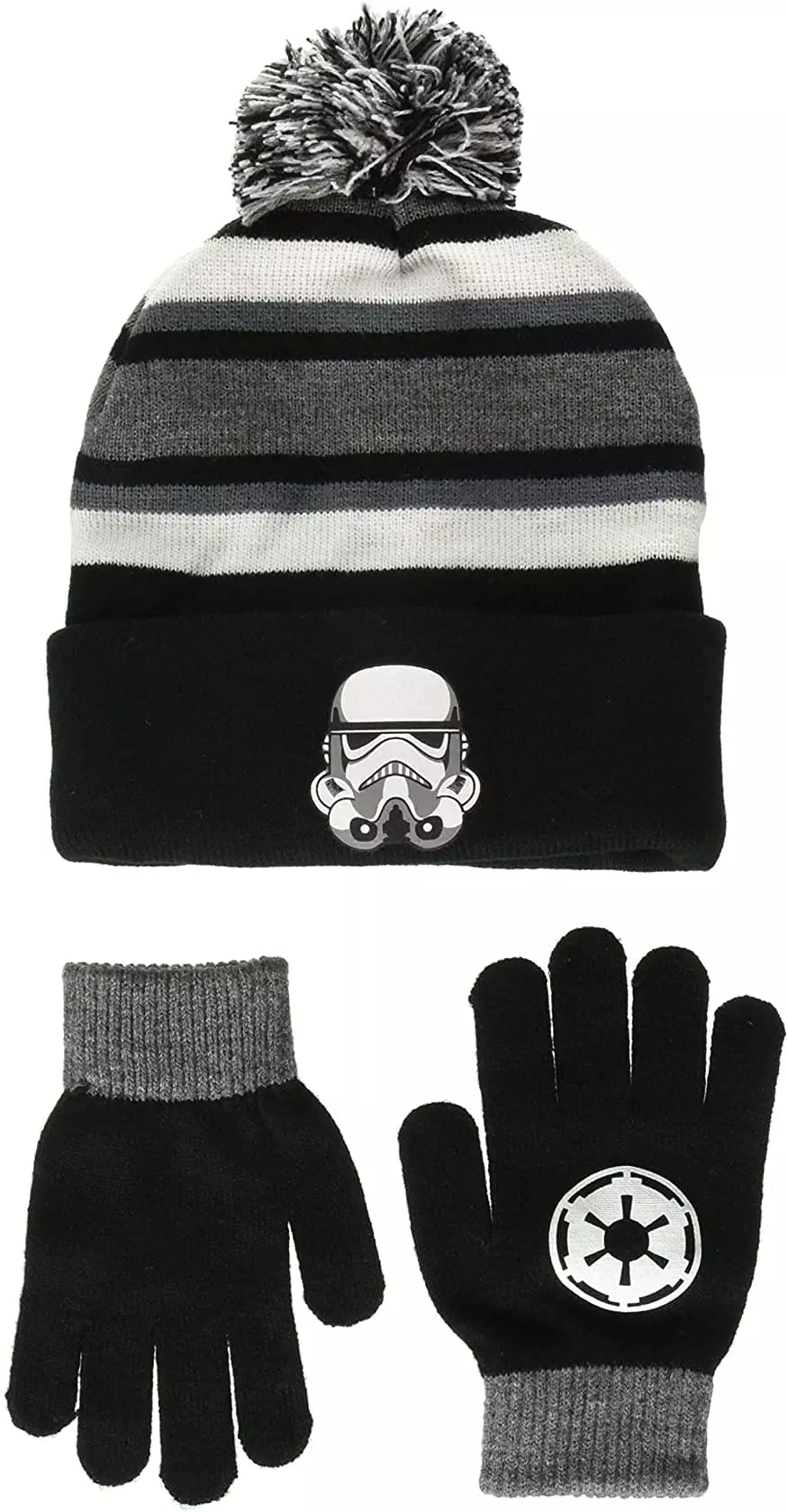 Show your loyalty to the Galactic Empire with this official Star Wars Stormtrooper knitted beanie and glove set. It is made from warm and durable 100% acrylic knit fabric. The winter beanie has a Stormtrooper helmet design. The set also includes a pair of glue printed gloves with the Galactic Empire logo. One size fits all.