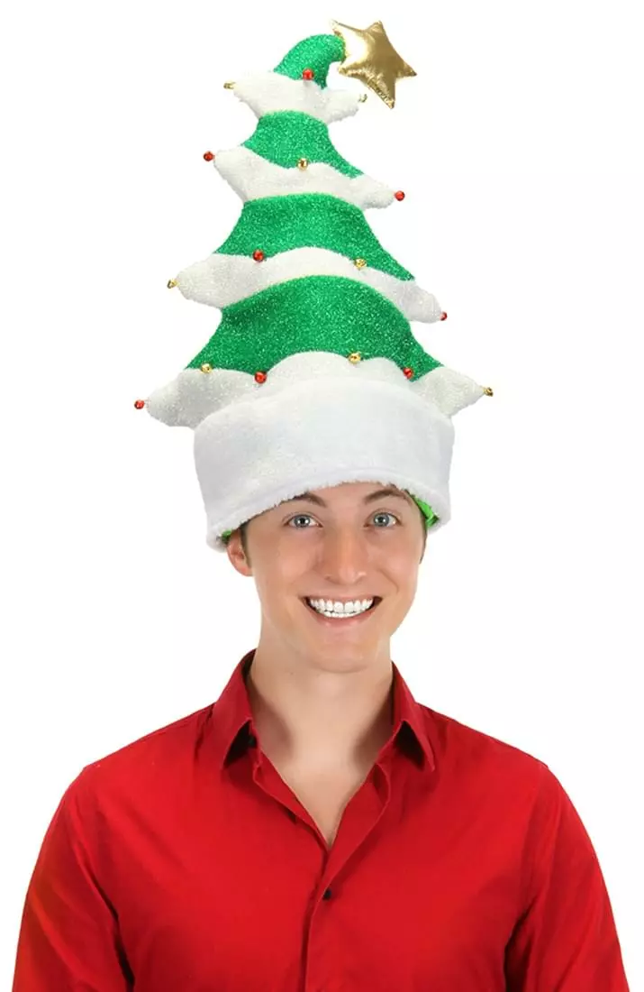 This Christmas tree hat is 21 inches tall with a spring built in to provide movement with the slightest turn of your head. This hat is made of green and white tinsel material for a shiny finish, and is embellished with metallic ornament lights and luxurious faux fur around the brim.