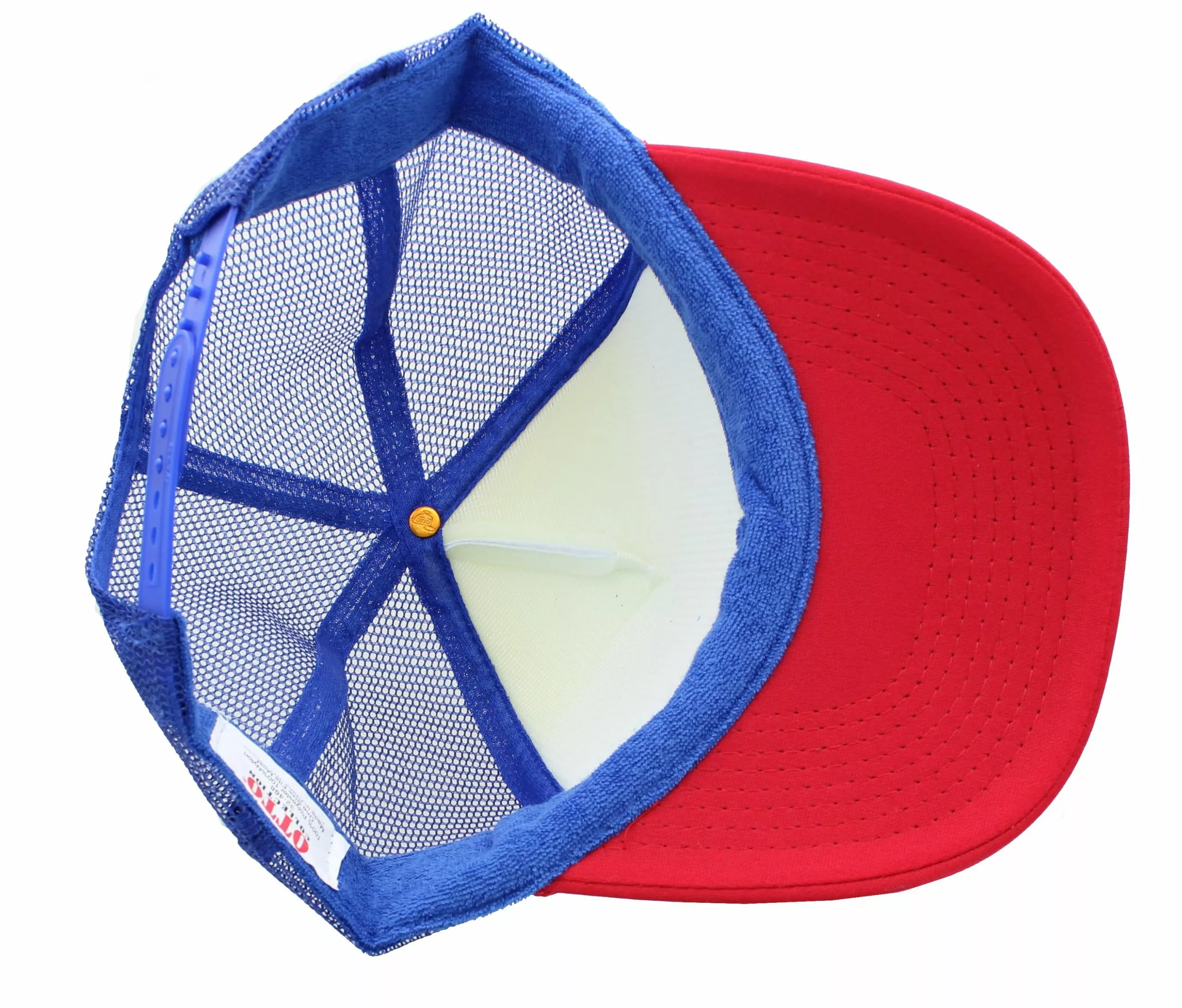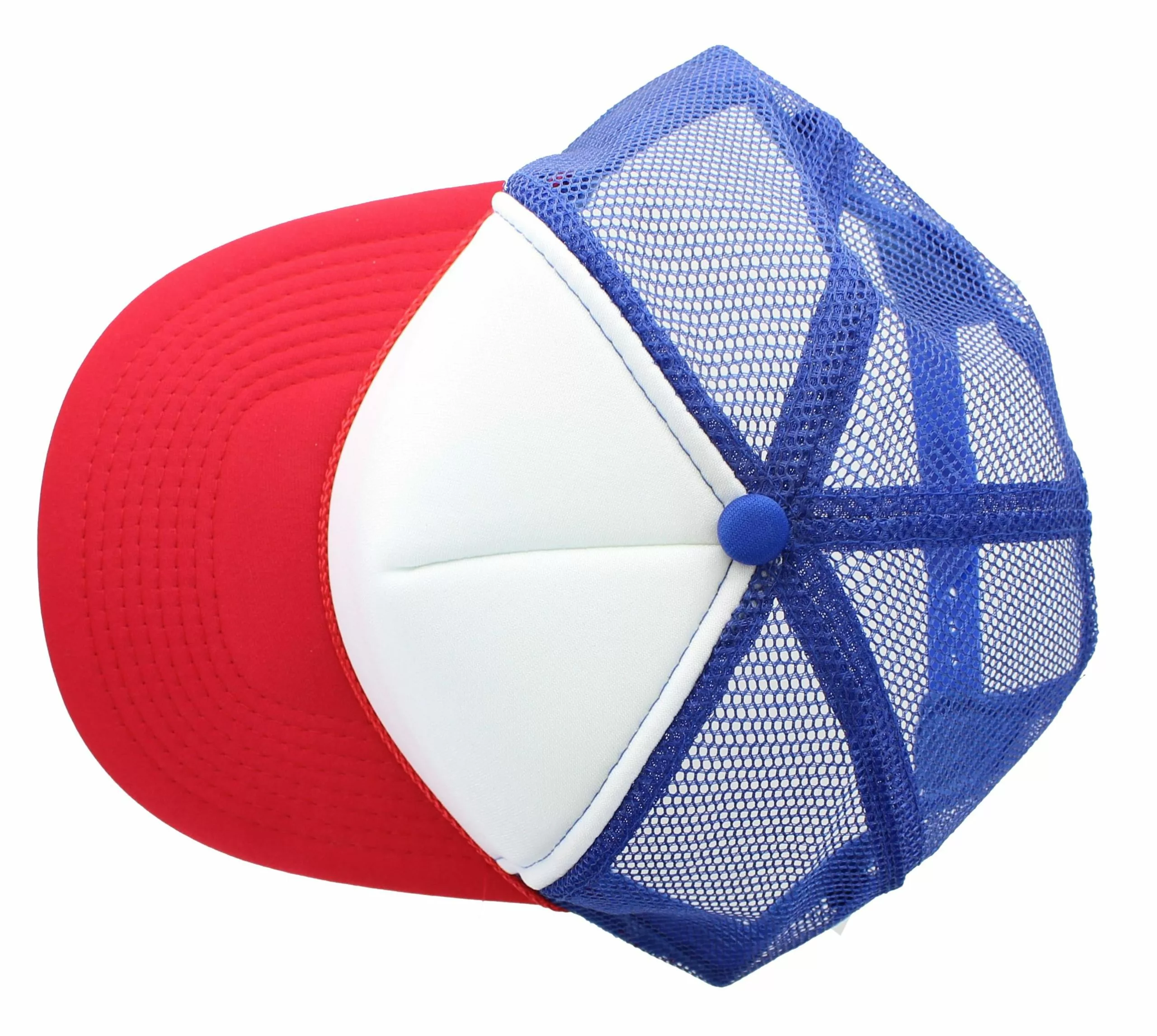 This foam/mesh adjustable “trucker hat” is similar to the hat worn by Dustin in the hit Netflix series, Stranger Things! The foam front-panel is blank (white), the mesh netting is royal blue and the brim is red.