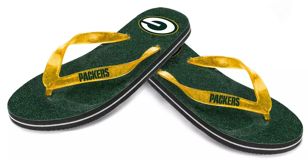 Kick up your heels and show some team spirit! Enjoy game day in these Green Bay Packers Women’s Glitter Thong Flip Flops.