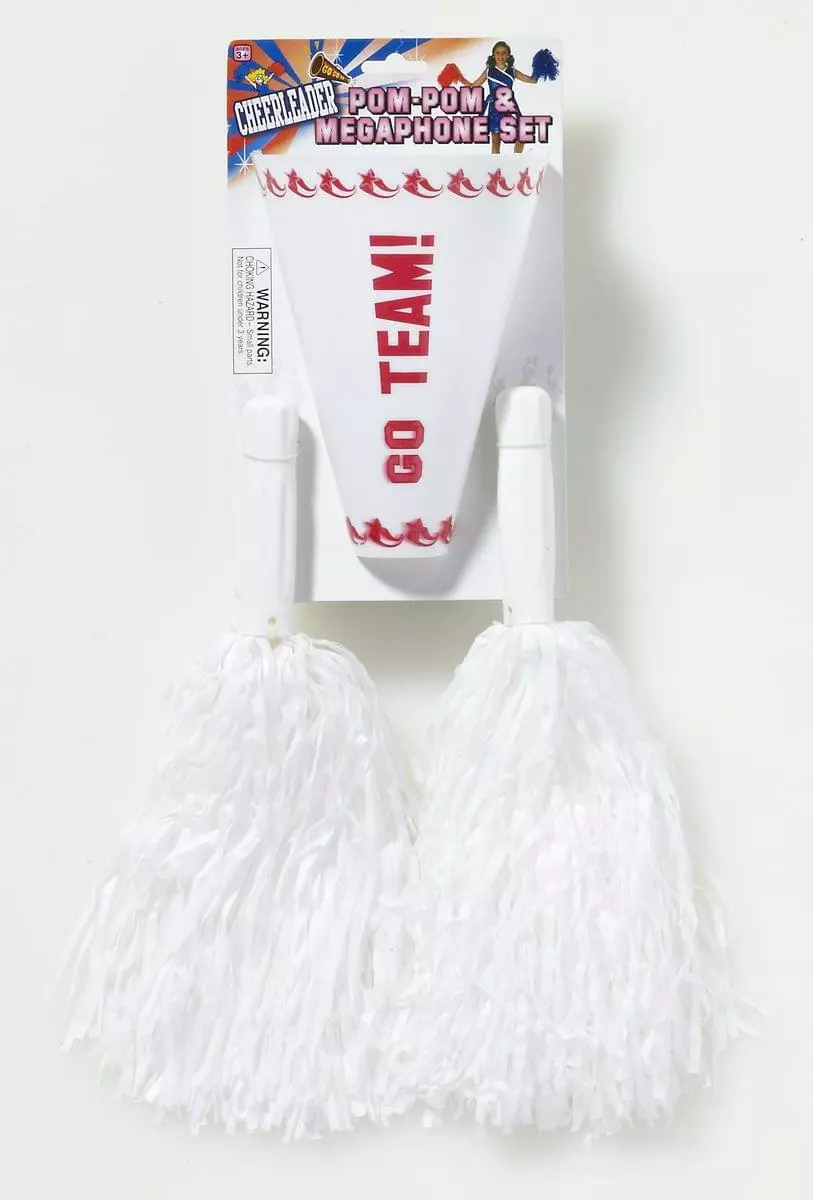 The white pom poms with megaphone is a must have to complete your cheer leader Halloween costume or is great to play with just for fun.