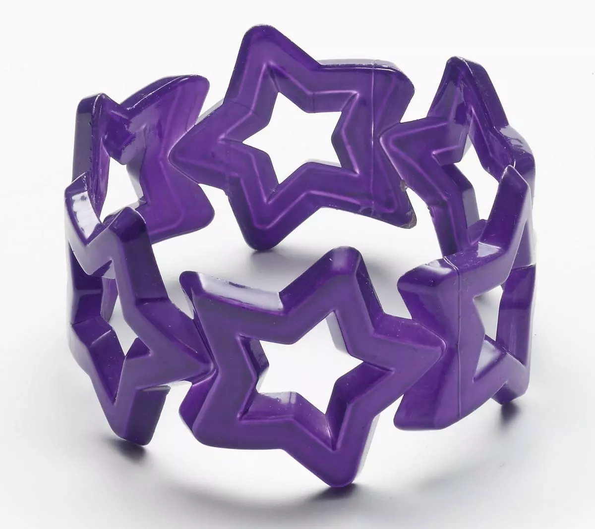 From the Club Candy collection, our adult Neon Purple Star Bracelet includes a purple plastic star-linked bangle bracelet. Costume jewelry is a simple, affordable way to pay attention to the small details of your character disguise. Our Neon Purple Star Bracelet is an ideal jewelry accessory for enhancing a rock star, 80s diva, rock band, rave or glamour costume. One size fits most teens and adults. Includes: Bracelet.