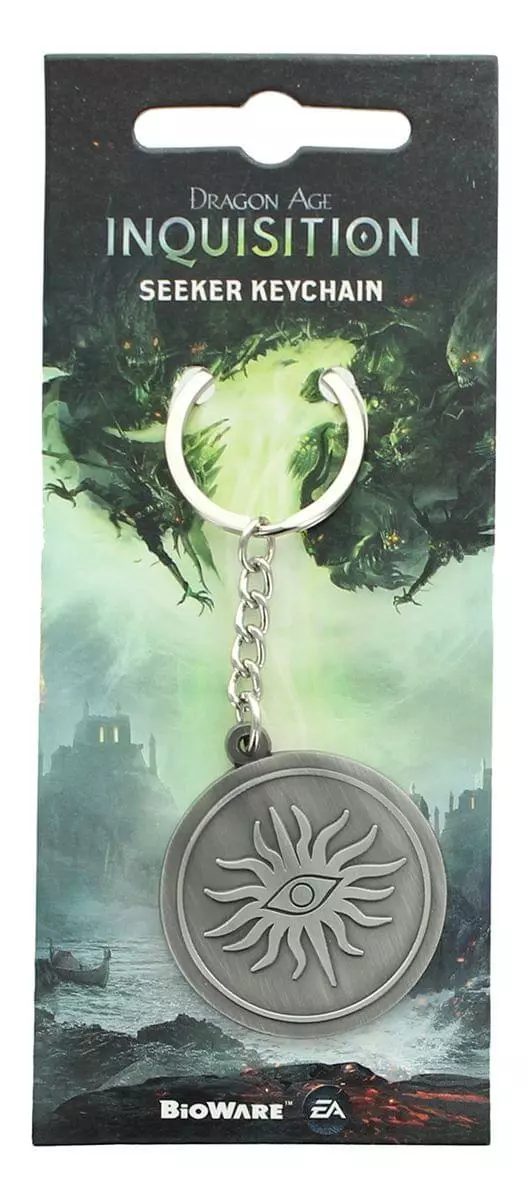 Show off your love of the video game Dragon Age: Inquisition with this stylish metal keychain! Keychain shows the “Seeker” logo and features raised and embedded details in a brushed metal finish. Pendant comes with a sturdy o-ring chain attachment for your keys. Officially licensed. Sure to make a great gift to any Dragon Age fan!