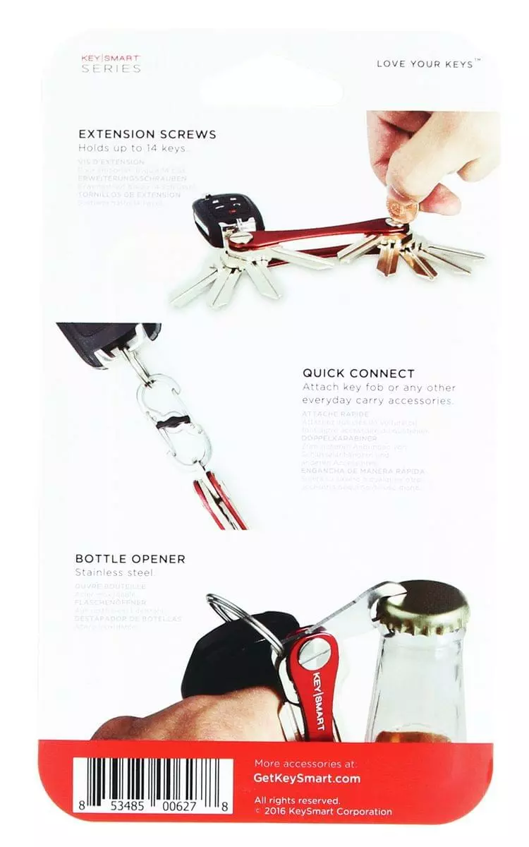 The KeySmart’s unique “S” shaped design allows you to hold between 2- 100 keys (with expansion packs, sold separately). Its compact size is smaller than a pack of gum (3 5/8″ overall). It is also universal, will fit almost any key found at your local hardware store! Includes loop piece to attach car keys. Made in the USA from aircraft aluminum, stainless steel hardware, and a laser engraved logo. Base model holds up to 4 keys, expansion packs for 5+ keys are available (sold separately).