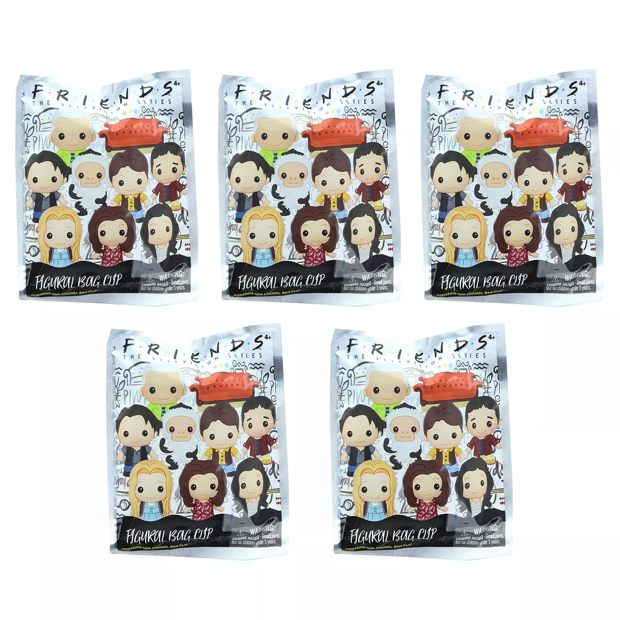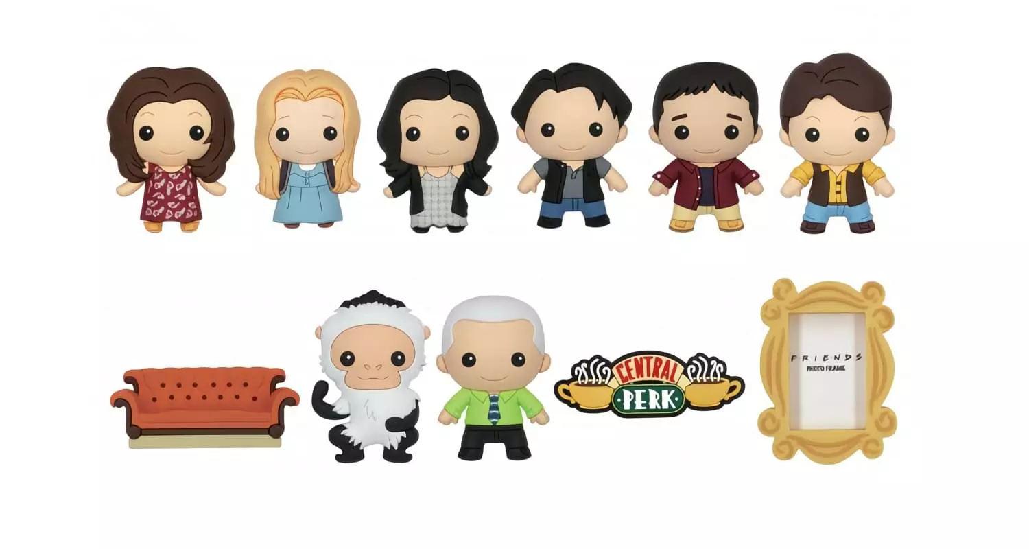 Monogram presents a blind bagged series of 3D Foam Figural Bag Clips based on the hit sitcom Friends! Series 1 includes Rachel, Phoebe, Monica, Joey, Ross, Chandler, the couch, Marcel, and Gunther. Plus, keep an eye out for the special rare Central Perk and mirror photo-frame chase figures! Each character has a sturdy clip attachment so you can take them with you wherever you go! Each blind bag includes one figural bag clip. Figure selection is random. Which one will you get? Collect them all!