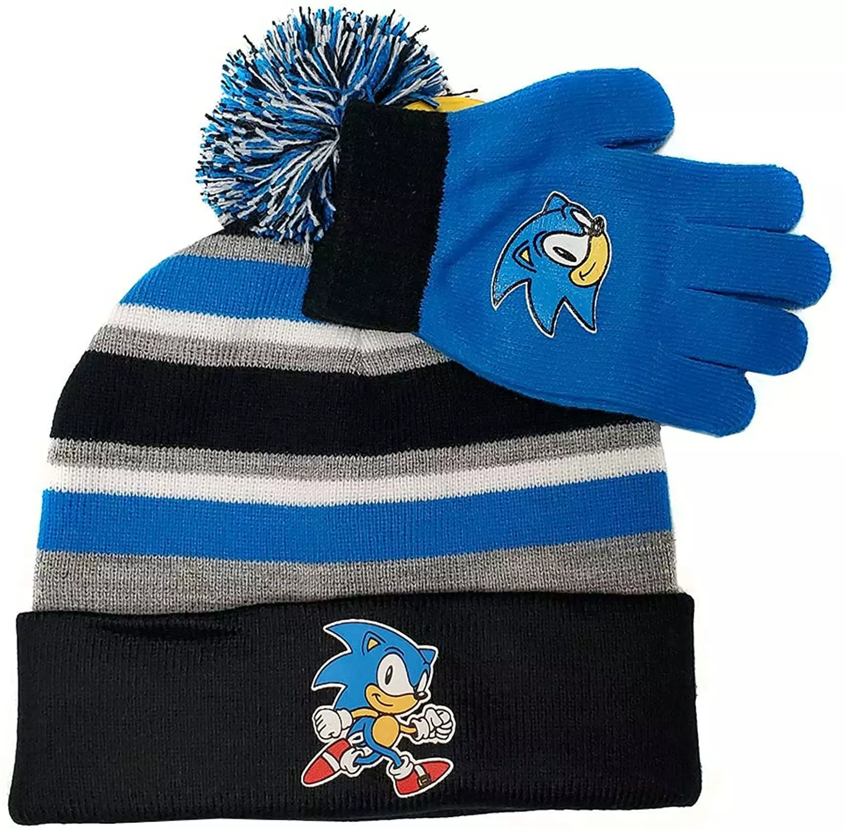 Keep warm while looking cool wearing this official Sonic the Hedgehog winter beanie and glove set! Stylish blue, black, white and grey beanie features an image of Sonic running and is topped with a pom pom. The set also includes a pair of matching blue gloves with a graphic of Sonic’s face. Made with 100% Acrylic knit fabric that is warm and comfortable with fleece lining. Hand Wash Only. Sized for children.
